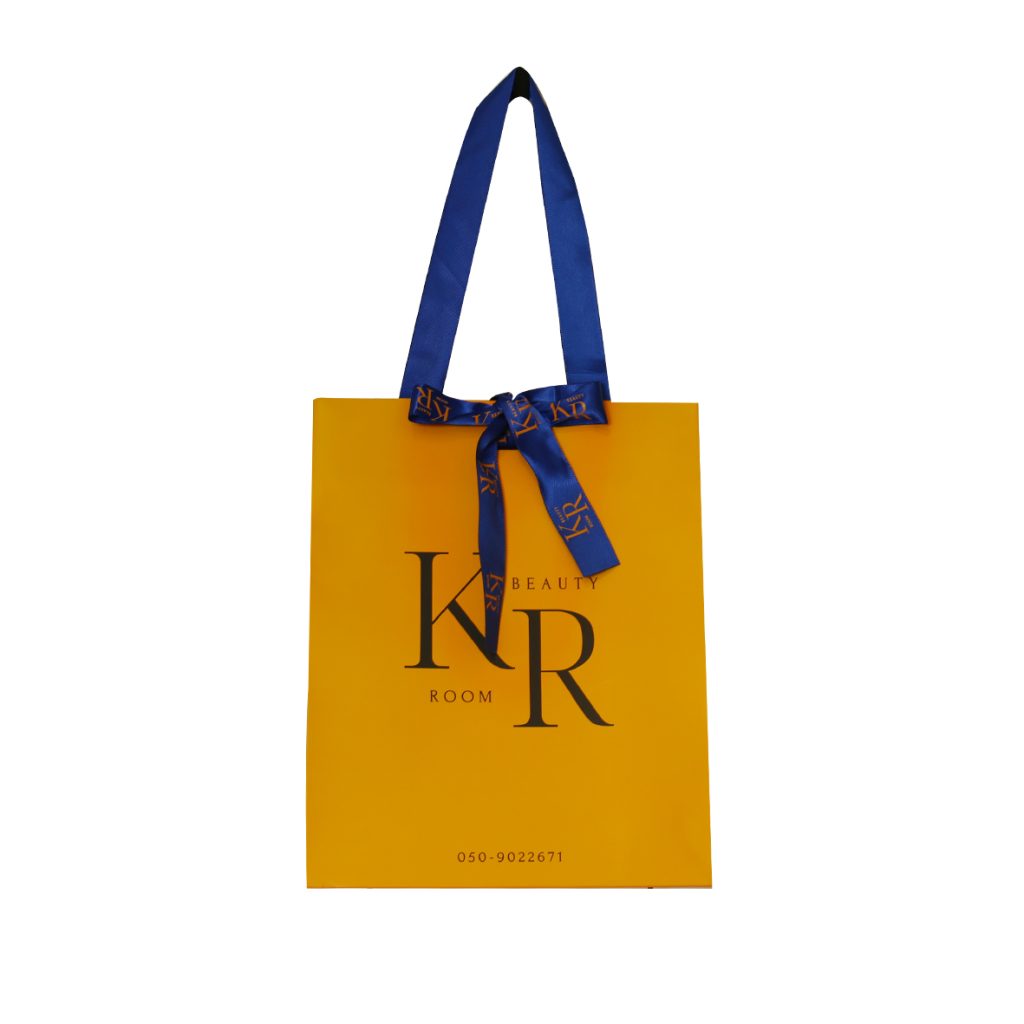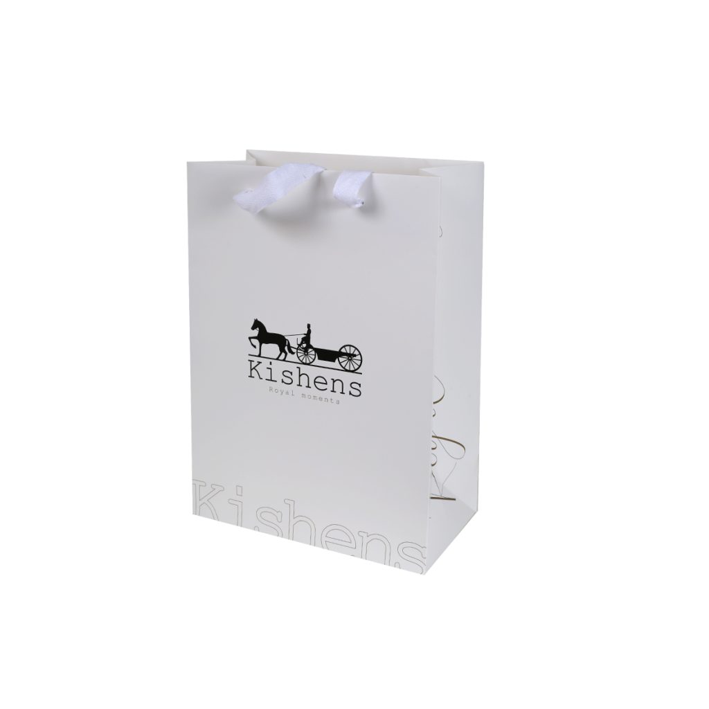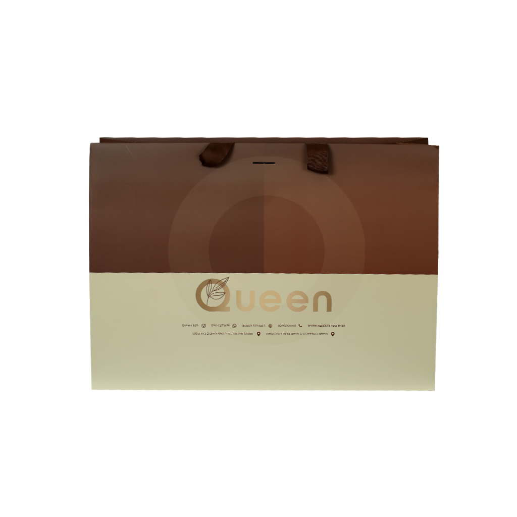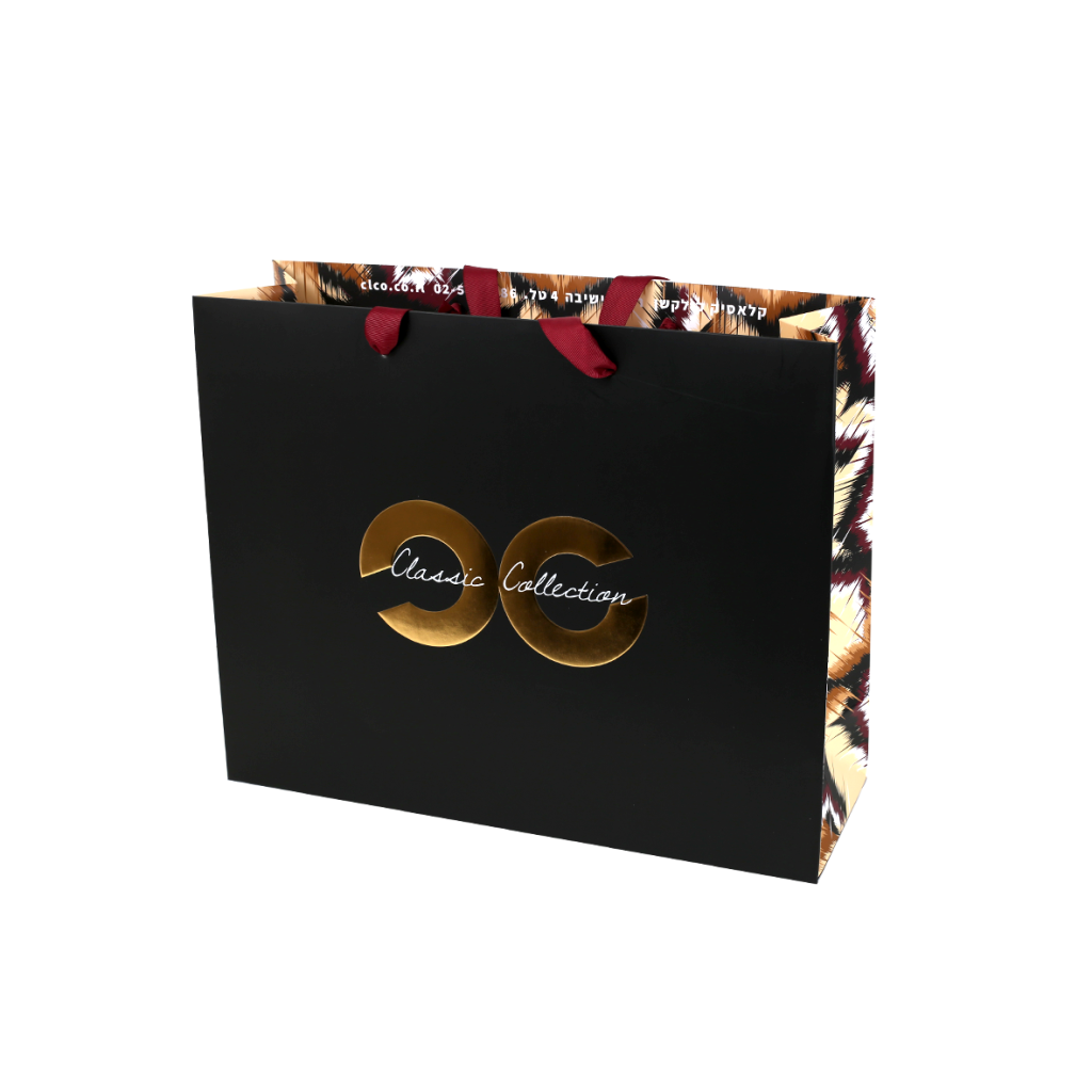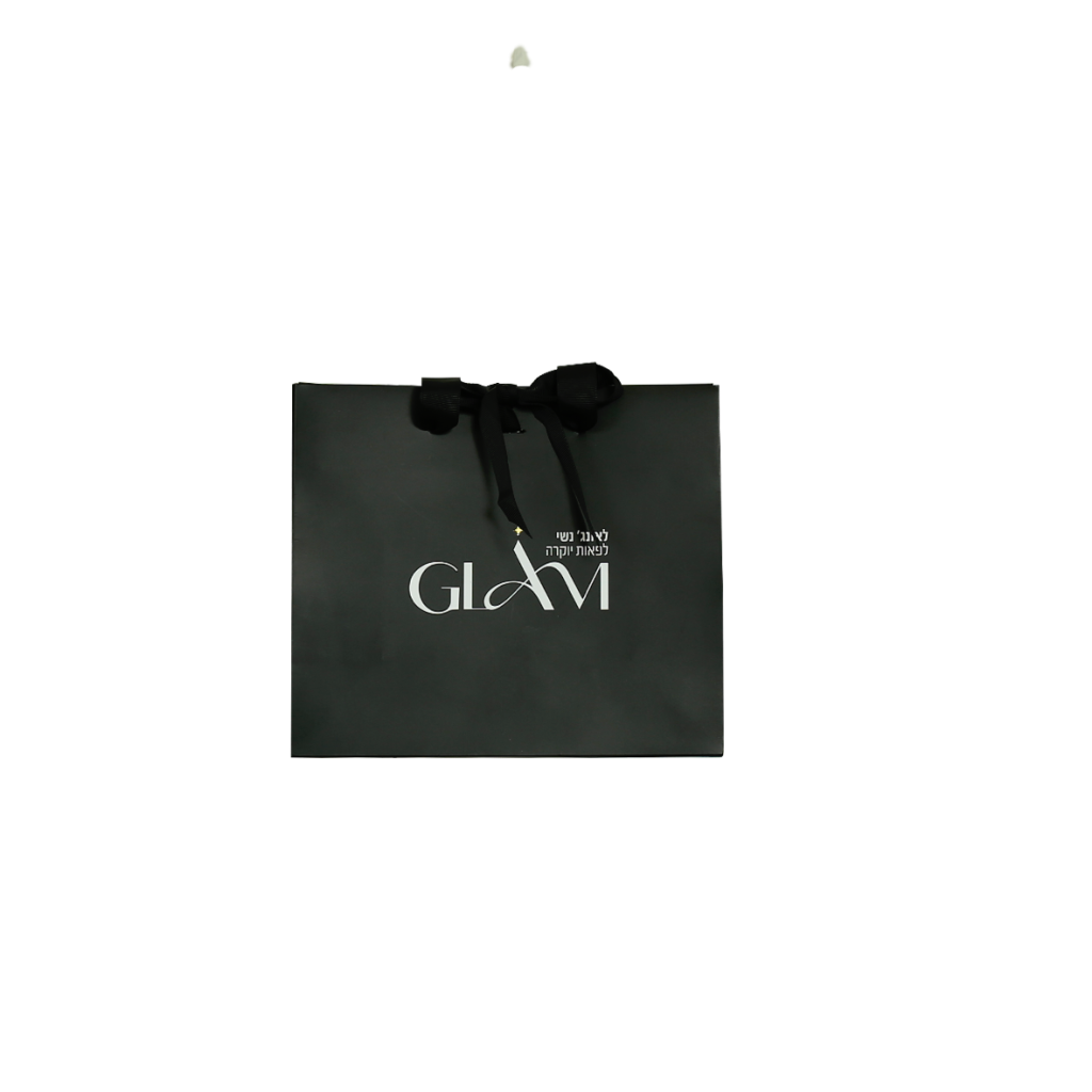 שקית קרטון מיוחדת עם הבלטה ללוגו, ידיות סאטן פנימיות לנראות נקיה