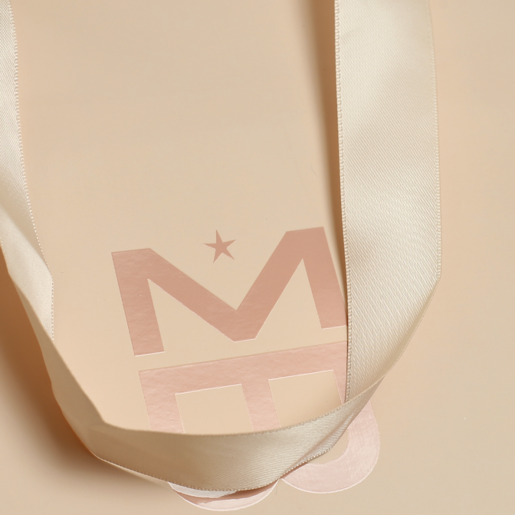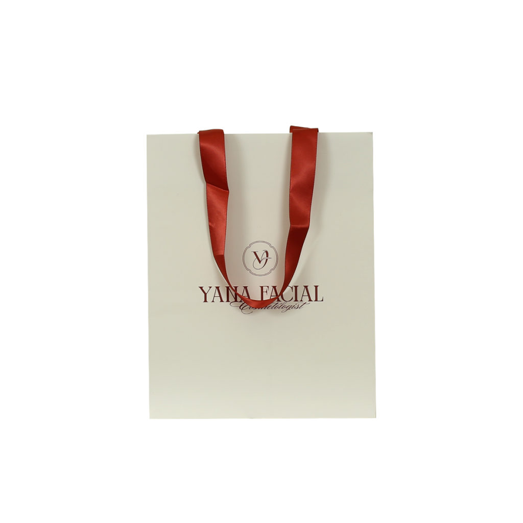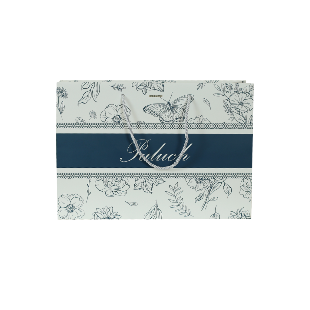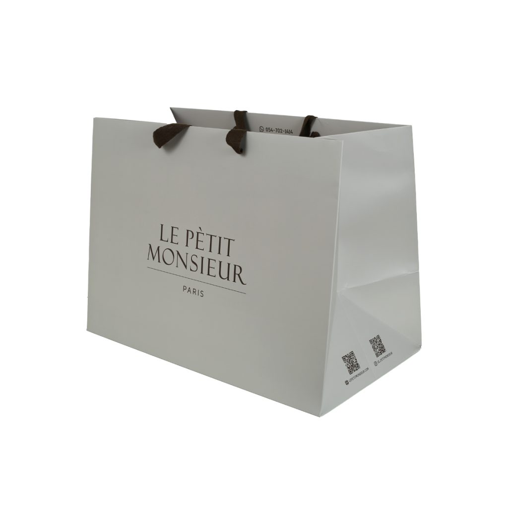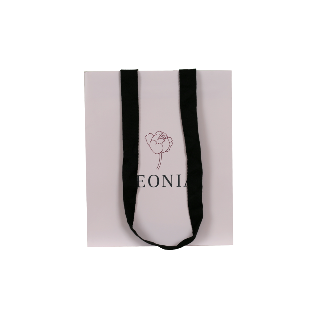 שקית קרטון מיוחדת עם הבלטה ללוגו, ידיות סאטן פנימיות לנראות נקיה