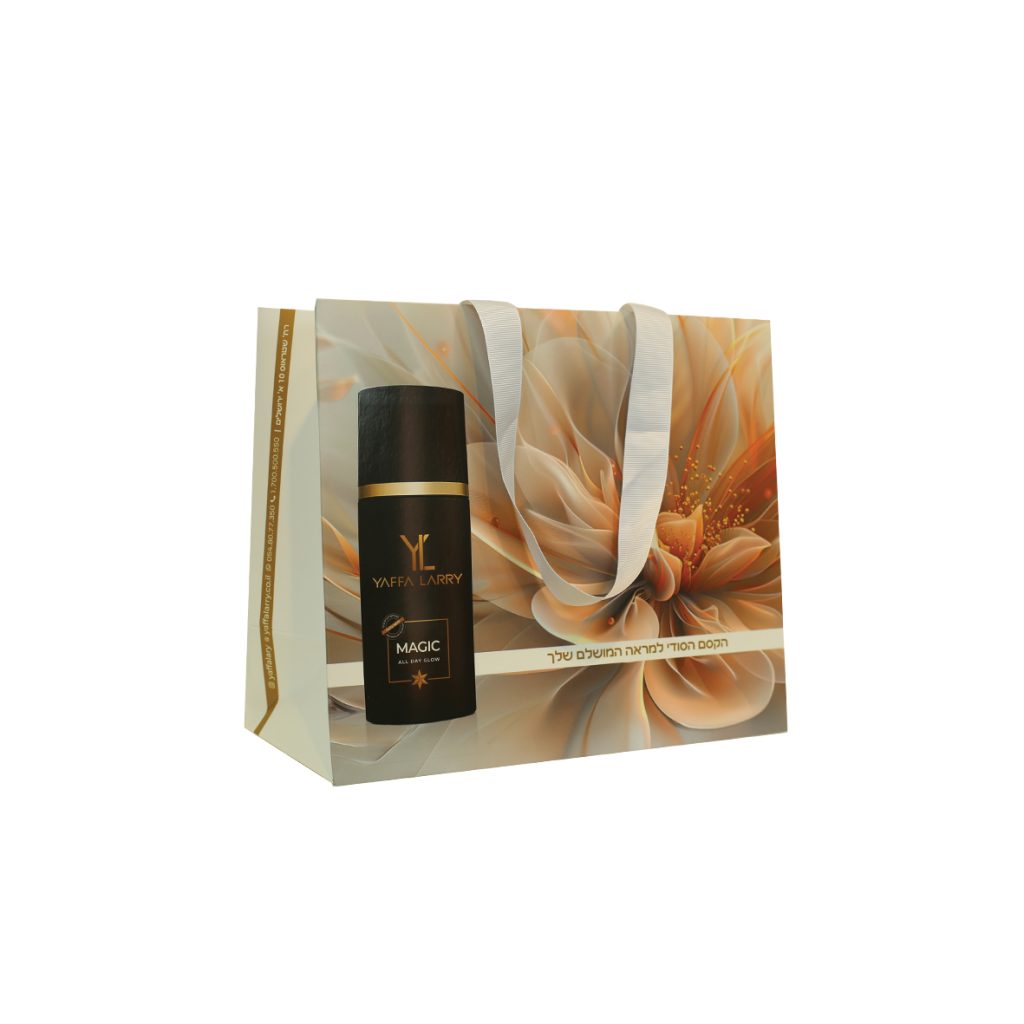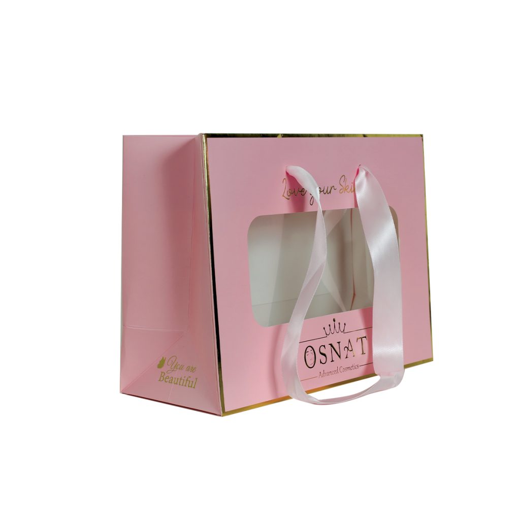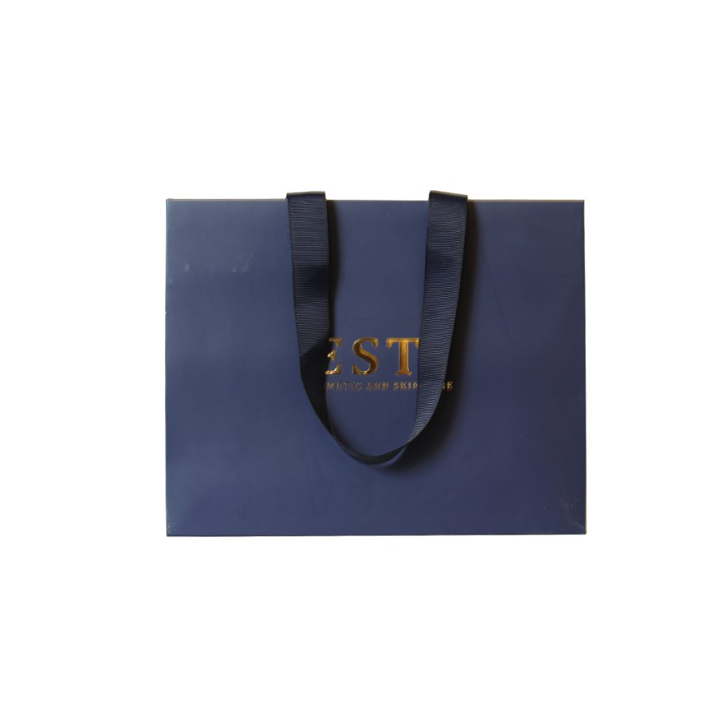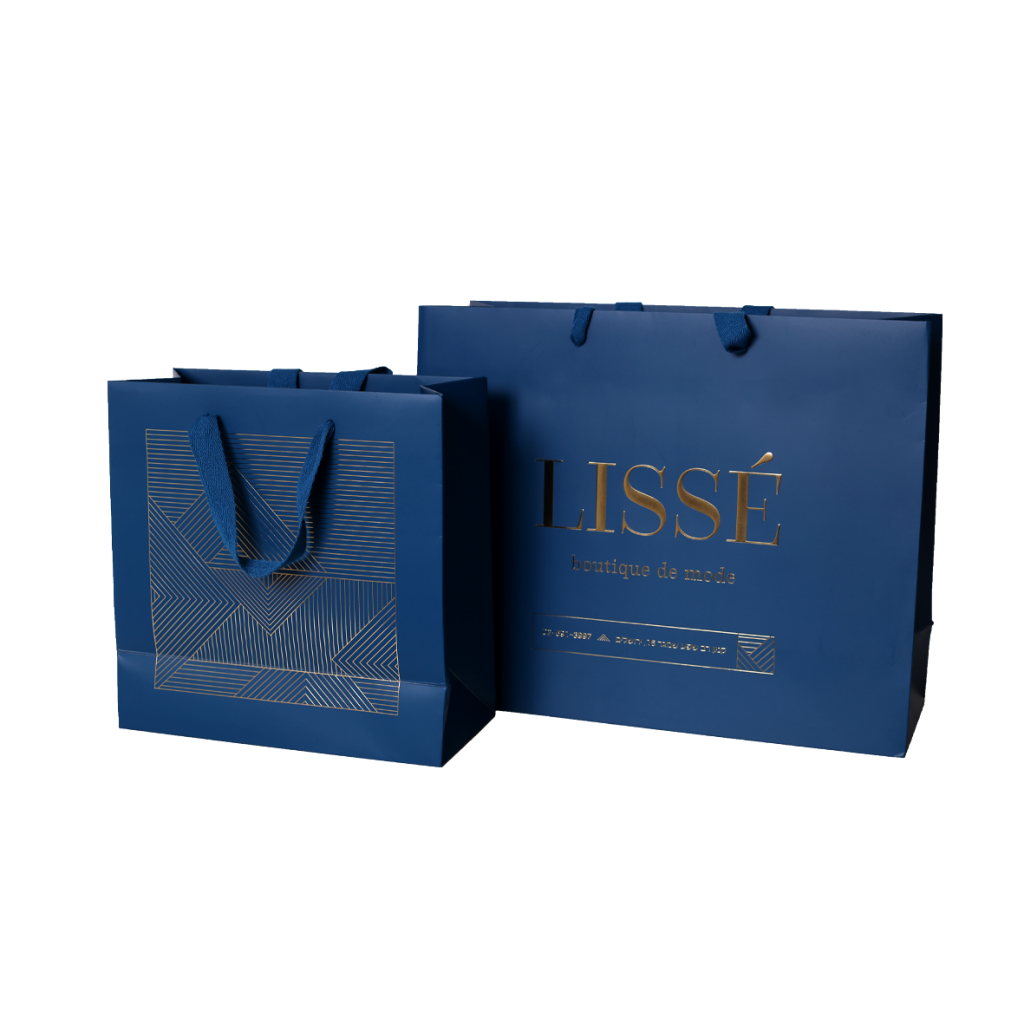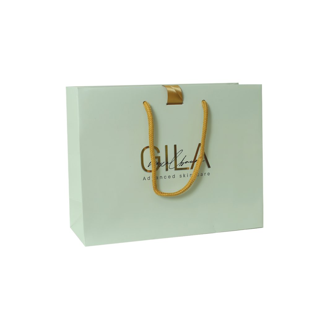 שקית קרטון מיוחדת עם הבלטה ללוגו, ידיות סאטן פנימיות לנראות נקיה