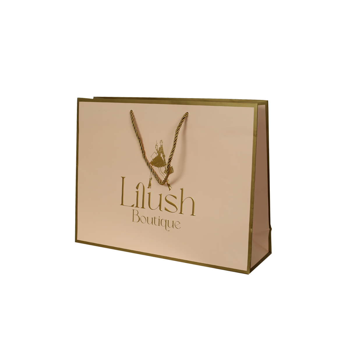 שקית קרטון בהטבעה בלוגו ומסגרת תואמת וידיות זהב מגולגלות